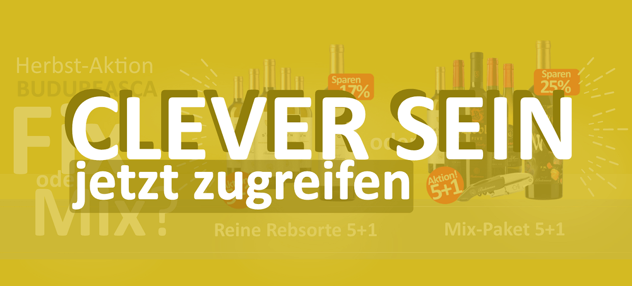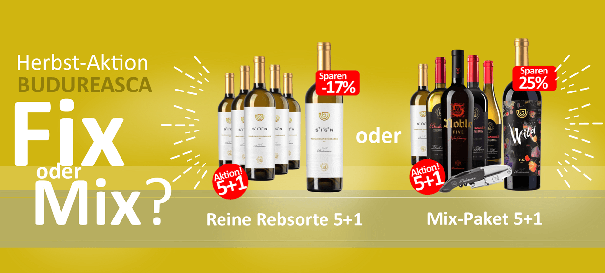 Bei unserer lohnenswerten Herbstaktion "Fix oder Mix" bezahlen Sie lediglich 5 Flaschen Budureasca Wein und bekommen